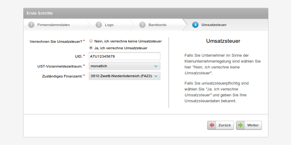 Abhängig davon ob Sie Umsatzsteuer verrechnen wird die Software für Sie angepasst. Wenn Sie z.B. Unternehmer im Sinne der Kleinunternehmerregelung sind oder aus sonstigen Gründen keine Umsatzsteuer verrechnen, werden Sie im weiterem Programmablauf auch nicht mit diesem Thema konfrontiert. Sind Sie jedoch umsatzsteuerpflichtig, so wird das gesamte Programm, alle Dokumente und die Einnahmen-Ausgaben-Rechnung daran angepasst.